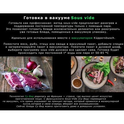 Компактный духовой шкаф с паром Kuppersbusch CBD 6550.0 Объем: 43 литраTFT-дисплей шириной 3,9" с текстовым и графическим полями14 режимов духового шкафа 8 специальных режимов 6 режимов приготовления на пару9 специальных режимов приготовления на пару Более 40 автоматических программ20 избранных программ для сохранения индивидуальных настроекЭлектронная система управления с сенсорными кнопкамиОтображение фактической температуры и рекомендуемойЭлектронный таймер (продолжительность программы, окончание, таймер обратного отсчета) с белыми индикаторамиСъемная дверца с полностью стеклянной внутренней поверхностьюЧетырехслойное остекление дверцыБыстрый разогревЭкономичный режимДемо-режимРежим ожиданияГалогенная подсветкаКонтактный дверной выключатель Катализатор Okoterm очищает воздух во время приготовления, таким образом стенки духового шкафа всегда абсолютно чистые! В отличие от энергоёмкой технологии пиролиза (разрушение частиц грязи путём дожигания) при температуре около 500°С, okotherm® не требует дополнительного времени и дополнительных затрат электроэнергии.Режимы работыВерхний и нижний нагревПодача тепла сверху и снизу обеспечивает равномерное приготовление продуктов, расположенных на одном уровне. Прекрасно подходит для выпечки пирожных и пирогов, например, изделий из дрожжевого теста, чизкейков и т. д.Обдув горячим воздухом с OkothermВентилятор распределяет тепло, генерируемое кольцевым нагревательным элементом, который расположен на задней стенке рабочей камеры. Обеспечиваемая таким образом одинаковая температура по всему объему рабочей камеры гарантирует равномерное приготовление блюд на всех уровнях направляющих, не ухудшая их вкус и запахВерхний и нижний нагрев с обдувом горячим воздухомТепло, генерируемое верхним и нижним нагревательными элементами, равномерно распределяется по объему рабочей камеры с помощью вентилятора. Прекрасно подходит для выпечки и жаренияРежим "пицца" с OkothermСочетание нижнего нагрева и обдува горячим воздухом оптимально подходит для приготовления изделий в виде хрустящей основы с мягкой начинкой. Идеально для пиццы, печенья или выпечки с начинкой из фруктов и паштетовНижний нагревБлагодаря теплу, генерируемому только нижним нагревательным элементом, данный режим прекрасно подходит для приготовления изделий с хрустящей основой или для получения более коричневой корочки снизу. Прекрасно подходит для приготовления очень мягких фруктовых пирогов и для легкого запекания тестовой основы пирогов перед приготовлениемВерхний нагревТепло, генерируемое верхним нагревательным элементом, прекрасно подходит для запекания и подрумянивания блюдECOРежим ECO позволяет уменьшить энергопотребление при приготовлении блюд. Для снижения потребления электроэнергии, духовой шкаф автоматически отключается за несколько минут до окончания приготовления блюда, используя тепло, остающееся в рабочей камере, для доведения блюда до готовностиИнтенсивный обдув горячим воздухом с OkothermВключенный верхний нагревательный элемент, помимо обдува горячим воздухом, используется для создания хрустящей корочки и подрумянивания блюда. Прекрасно подходит для приготовления запеченного картофеля, жарения или запеканияГриль + нижний нагревТепло от нижнего нагревательного элемента и расположенного сверху гр