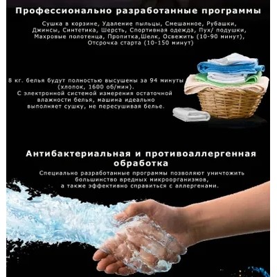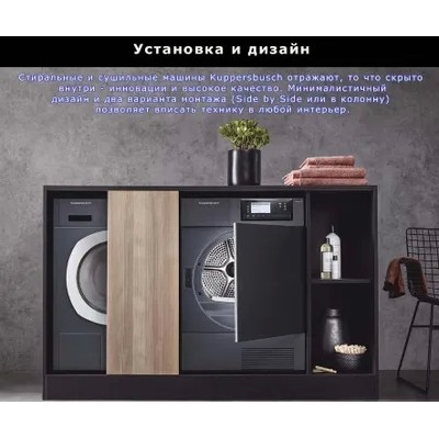 Сушильная машина Kuppersbusch T 40.0 R Ever RoseПрограммы/дополнительные программы: Автоматические программы для хлопка и немнущихся тканейОт степени сушки «под утюг» до «экстра-сухое»Специальные программыСушка в корзине, Удаление пыльцы, Смешанное, и другие программы: Рубашки, Джинсы, Синтетика, Шерсть, Спортивная одежда, Пух/ подушки, Махровые полотенца, Пропитка, Шелк, Освежить (10-90 минут), Отсрочка старта (10-150 минут)ИзбранноеСохраняет до 6 Ваших любимых программДополнительные функцииАнтибактериальная обработка, Бережный уход +, Сушка +, Отсрочка старта, Экспресс8 кг белья будут полностью высушены за 96 минут («в шкаф»)Преимущества:Большой цветной дисплей 4,3’’Корзина для сушки деликатных тканей и спортивной обувиСушильная машина конденсационного типа с технологией Heat Pump и система самоочистки Autoclean для эффективного использования электроэнергии на протяжении всего срока службы машиныВысший уровень эффективности конденсацииПрограмма антибактериальной обработки для гигиенической сушки бельяПрограмма «Удаление пыльцы» позволяет очистить ткани от пыльцыПревосходная шумоизоляция, макс. 61 дБ(А)Светодиодная подсветка барабанаЗащита от складокЭлектронная система измерения остаточной влажности бельяИндикация хода программы и времени до окончания программы, отложенный запуск – до 7 днейРегулируемый по интенсивности акустический сигнал окончания программыУгол открывания люка – 180°, диаметр люка – 36/31 смВозможность перенавески люка (правая/левая)Защита от детейКонтроль температурыСпециальные программыСушка в корзинеВлажные вещи из шерсти желательно как можно меньше подвергать воздействию, так как они имеют тенденцию сморщиваться и садиться. Спортивная обувь может повредить барабан из-за своего веса. Использование корзины позволяет выполнять деликатную сушку без перемещения отдельных стойких к машинной стирке предметов: шерстяные изделия, спортивную обувь из синтетических материалов или искусственной кожи, шапки, велосипедные шлемы, мягкие игрушки, игрушки и пр.СмешанноеЭта программа оптимально подходит для сушки смешанной партии белья из хлопка и синтетикиДругие программыИспользуйте эти программы для оптимальной сушки различных видов текстиля, например сорочек, блузок, джинсов, шерсти и пр.Дополнительные программыАнтибактериальная обработкаПри выборе этой программы увеличивается время дополнительной сушки, что позволяет уничтожать большинство бактерийБережный уход плюсДля бережной сушки деликатных вещей. Температура сушки пониженаОтсрочка стартаС помощью данной программы запуск программы можно отложить на более позднее время в соответствии со своим привычным образом жизни (например, для использования льготного ночного тарифа на электроэнергию)Сушка +При выборе этой программы временно увеличивается степень сушки — на время работы выбранной программыВремяПри открытии программы с управлением по времени отображается минимальное время выполнения программыЭкспрессДля быстрой сушки небольшой партии или отдельных изделий из хлопка, синтетики или смешанной тканиХарактеристики:Конденсационная сушильная машина с технологией Heat PumpЗагрузка 1-8 кгСтационарная установка/установка в колоннуНавеска люка левая/праваяВозможность изменения навески люкаРазмеры прибора (Ш х В х Г): 595 х 850 х 640 ммСделано в Швейц